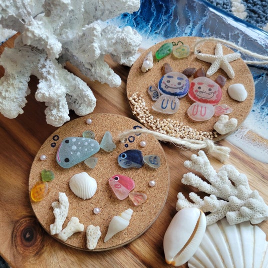 作家自らが海へ足を運び、拾い集めたシーグラスを使用して、可愛らしいアートオーナメントやデコレーションフォトフレームを製作。