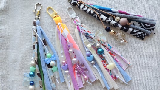 リサイクル素材の紐を使ったマクラメ編みや、Tシャツヤーンの端切れとチャームを組み合わせたキーホルダーづくり。