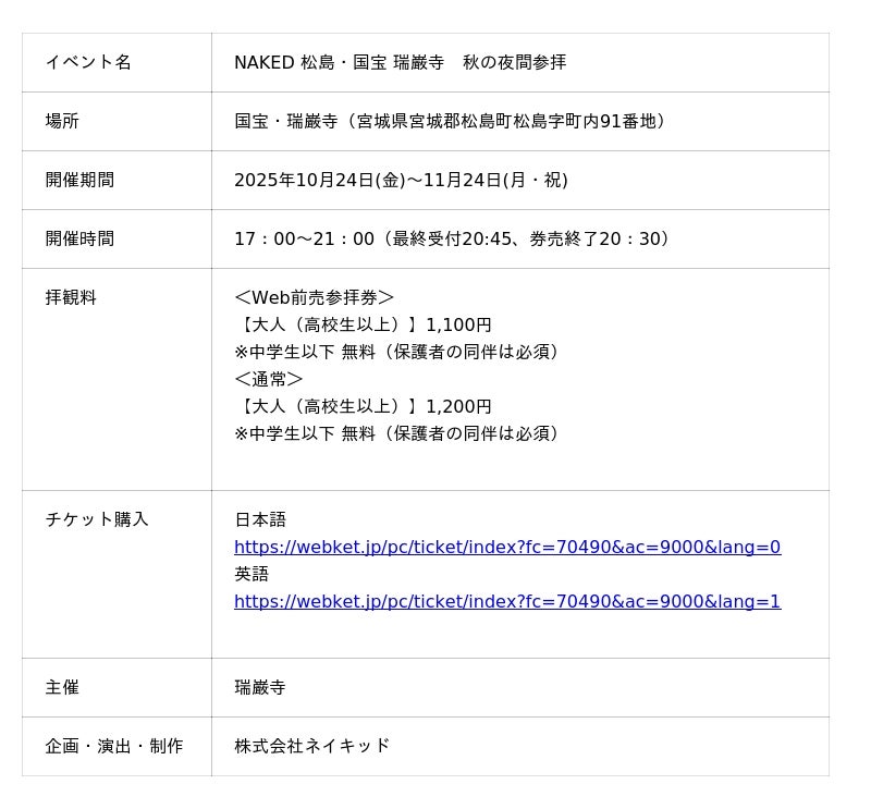 株式会社ネイキッド(英語表記:NAKED, INC. 、所在地:東京都渋谷区、代表:村松亮太郎)は、国宝・瑞巌寺(宮城県宮城郡松島町)にて、2025年10月24日(金)~11月24日(月・祝)の期間、『NAKED 松島・国宝 瑞巌寺 秋の夜間参拝』(主催:瑞巌寺)を開催いたします。