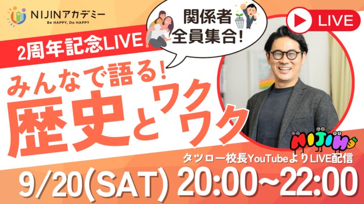 名称:NIJINアカデミー開校2周年記念 YouTubeライブ日時:2025年9月20日(土)20:00~22:00