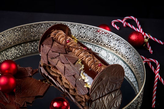 伝統的なフランスのクリスマス菓子「ブッシュドノエル」を、上質なチョコレートで贅沢に仕上げました。中心にはカカオ55%の口当たりの柔らかなチョコレートクリームを配置し、その周りをカカオ66%の濃厚なガナッシュで包み込みました。カカオの異なる風味が層となって織りなし、酸味の効いたフランボワーズジャムがチョコレートの深いコクを引き立て、重たくなりがちなチョコレートに爽やかなアクセントを与えています。さらに、しっとりとしたチョコレートスポンジ生地が全体をまとめ、まろやかな口当たりをお楽しみいただけます。