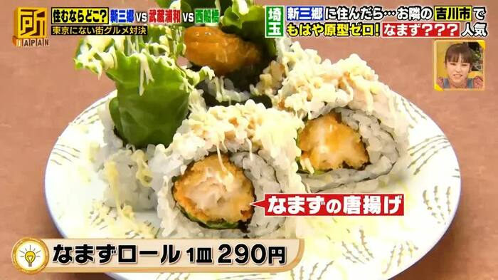 ほかにも、「沖寿司 吉川店」では、唐揚げにしたなまずをチーズソースで包んだ「なまずロール」(1皿290円)というメニューが。