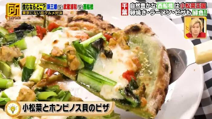 イタリアンレストラン「コンパーレ・コマーレ」では、たっぷりの小松菜が使われた「小松菜とホンビノス貝のピザ」を販売。