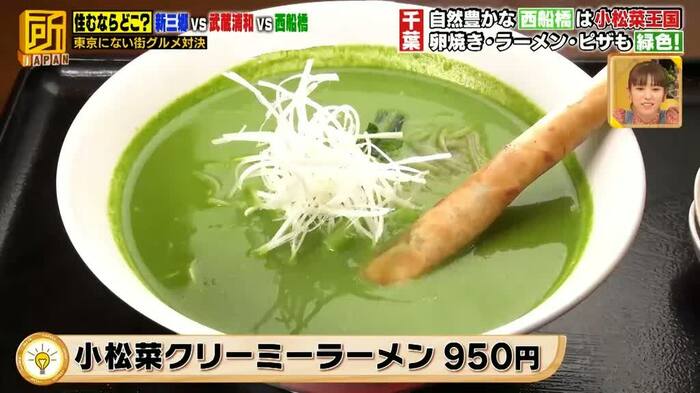 中華料理店「中華 ひろや」では、小松菜入りの緑のスープに小松菜を練り込んだ麺が使用された「小松菜クリーミーラーメン」(950円)を販売。