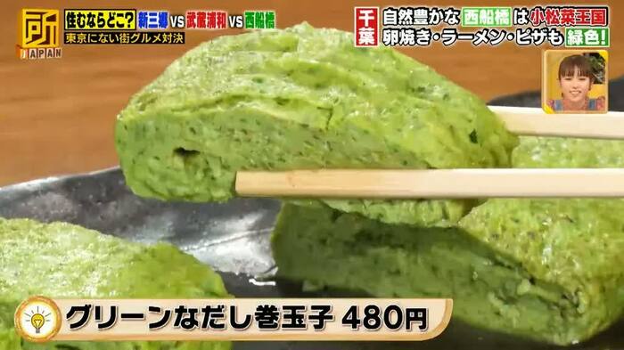 西船橋の小松菜愛は、「小松菜ハイボール」だけにとどまらず、こちらのお店では、卵にだしと小松菜ペーストを混ぜ合わせた「グリーンなだし巻玉子」(480円)も提供されていました。