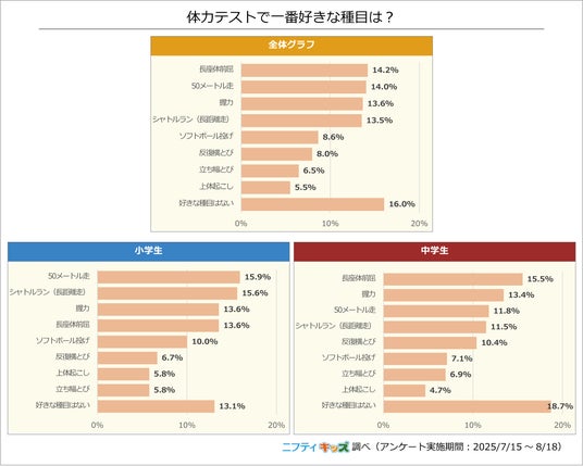 体力テストで最も好きな種目は、小学生では「50メートル走」、中学生では「長座体前屈」が1位でした。一方、苦手な種目は、小中学生ともに「シャトルラン(長距離走)」が1位となりました。また、小中学生の多くが、体力テストの種目として「ダンス」を取り入れたいと考えていることもわかりました。