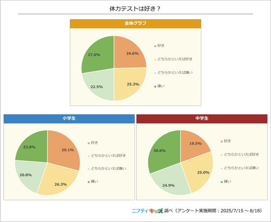 小中学生の約7割が、スポーツを「好き」「どちらかといえば好き」と回答しました。しかし、体力テストになると、「好き」「どちらかといえば好き」という肯定的な意見と、「嫌い」「どちらかといえば嫌い」といった否定的な意見は半々となりました。