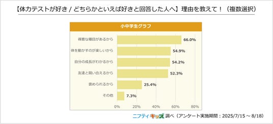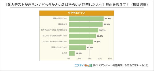 一方、体力テストが嫌いな理由で最も多く選ばれたのは、「運動が苦手だから」でした。「疲れるから」や「他の子と比べられるのが嫌だから」といった理由も上位となり、その他には、「友だちに見られるのが嫌だから」「緊張してしまうから」といった回答もありました。苦手なことを人前で行うことや、運動能力を他人と比較されることを嫌う人が多いようです。