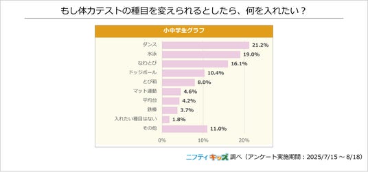 小中学生が体力テストに取り入れたいと考えている人気の種目は「ダンス」でした。あとに「水泳」「なわとび」が続きます。その他には、「サッカー」「野球」「バドミントン」などの意見もありました。