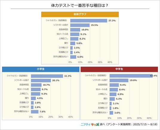 苦手な種目のランキングは小中学生で同様の結果となりました。