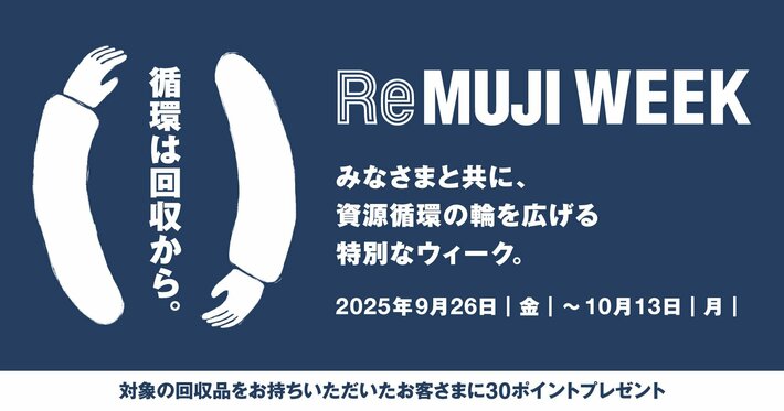 また、「ReMUJI WEEK」と題し、9月26日(金)から10月13日(月)までの間で対象店舗にご不要になった無印良品の対象商品のいずれかをお持ちいただいたお客さまに、通常10ポイントのところ、期間中は30ポイントを付与します。※1