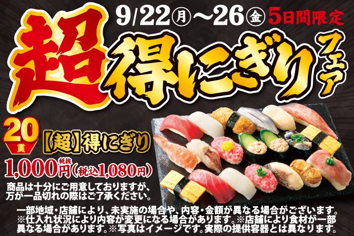 毎回大変ご好評いただいております、人気企画を限定店舗にて販売します!!日頃のご愛顧に感謝の気持ちを込めて…『【超】得にぎりフェア』を開催します!