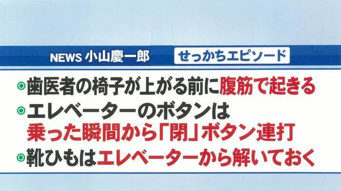 他にも、「エレベーターに乗っている間に靴ひもを解いておく」「エレベーターのボタンは乗った瞬間から『閉』ボタン連打」など、小山のせっかちエピソードが次々に紹介されるが、中丸は「エレベーターの『閉』のボタンは理解できるけど…」と首をひねり、和泉も「ひも靴を履いている時点で“せっかち”ではない」と苦笑した。