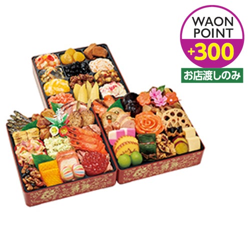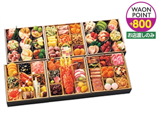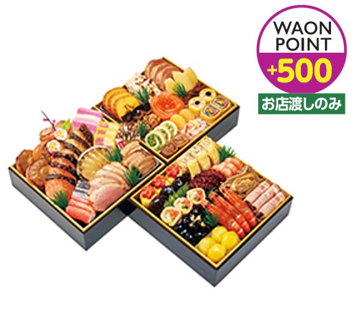 毎年多くのお客さまにご好評いただいている生詰めおせちのほか、こだわりの豪華食材を堪能できるおせちを多数ご用意しております。こちらの商品は、店舗でのお渡しの場合に限りWAON POINTボーナスポイントを進呈いたします。