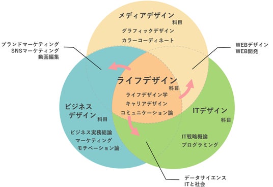 専門科目は、「メディアデザイン」「ビジネスデザイン」「IT デザイン」を中心に構成され、主となる専門分野を深く学びながら、他の専門領域も横断的に履修できる仕組みになっています。