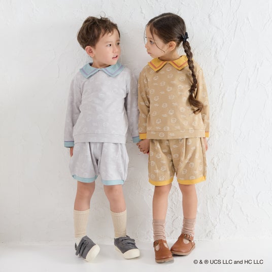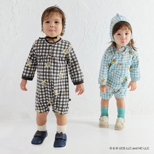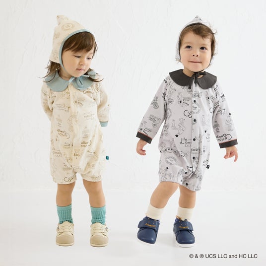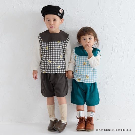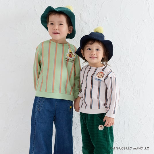 コラボアイテムは全 11 型 19 カラーで構成されており、2024 年に即完売し人気を博したアイテムパターンからインスピレーションを得て、モイモルンらしいデザインを基調に「おさるのジョージ」をモチーフにしたユニークなラインアップを展開いたします(一部アイテムには“黄色い帽子のおじさん”もさりげなく登場)。人気のセットアイテムをはじめ、ベビー向けのカバーオールや、幅広い世代でお楽しみいただけるハットなど、全身でコーディネートしていただけるアイテムをご用意しました。ユニセックス展開のため、兄弟姉妹でのお揃いコーデにもおすすめです。