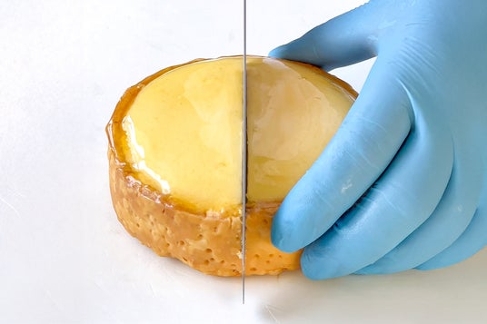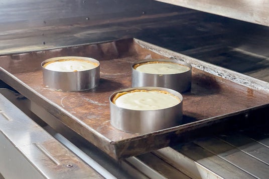 スフレのように湯煎でゆっくり焼く方法とは違い、このチーズタルトはガッと高温で短時間焼き上げるのがポイント。焼きすぎると生地に入った卵の影響で生地が固くなってしまうため、職人の経験と感覚が命を握る工程です。