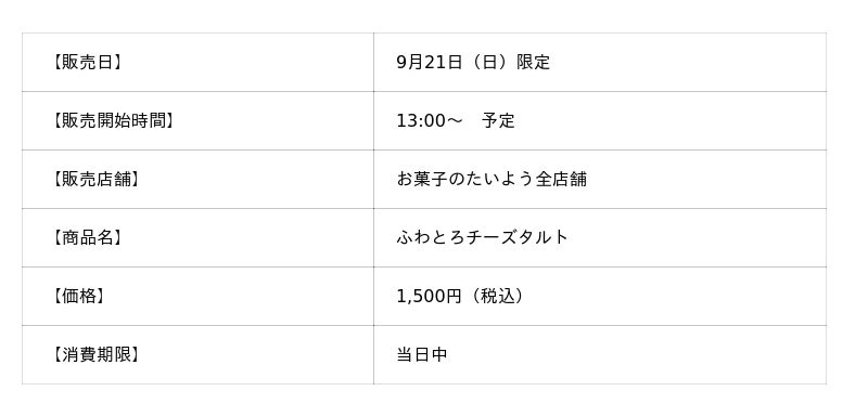 株式会社太陽社(所在地:千葉県匝瑳市飯倉293、代表取締役:片岡正裕)が展開する、千葉県で長年愛され続ける菓子店「お菓子のたいよう」では、これまでのチーズタルトの常識を覆す最新作スイーツ『ふわとろチーズタルト』を2025年9月21日(日)13:00より1日限定で販売いたします。