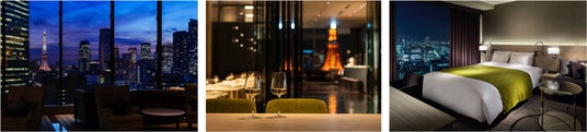 写真左から:東京タワーが間近にせまるロビー、レストラン、銀座エリアを見渡す全室16階以上