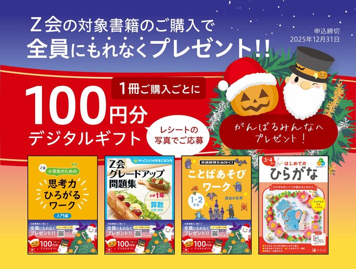 株式会社増進会ホールディングス(Z会グループ)のグループ会社、株式会社Z会ソリューションズは、対象書店にて、Z会の小学生向け書籍・Z会の幼児ワークを購入すると、1冊ごとに100円分のデジタルギフトをプレゼントするキャンペーンを、2025年9月8日(月)~2025年12月31日(水)まで実施いたします。