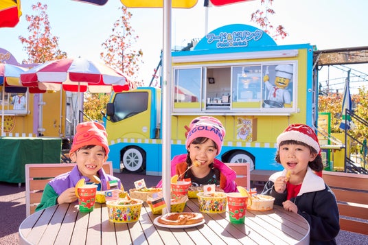 【世界のグルメスタンド クリスマスver./各900円】毎年クリスマスに大人気の、レゴランド(R) がある9カ国(デンマーク・ドイツ・イギリス・アメリカ・マレーシア・アラブ⾸長国連邦(ドバイ)・韓国・日本・中国)のメニューを集めたキッチンカーが今年も集結。