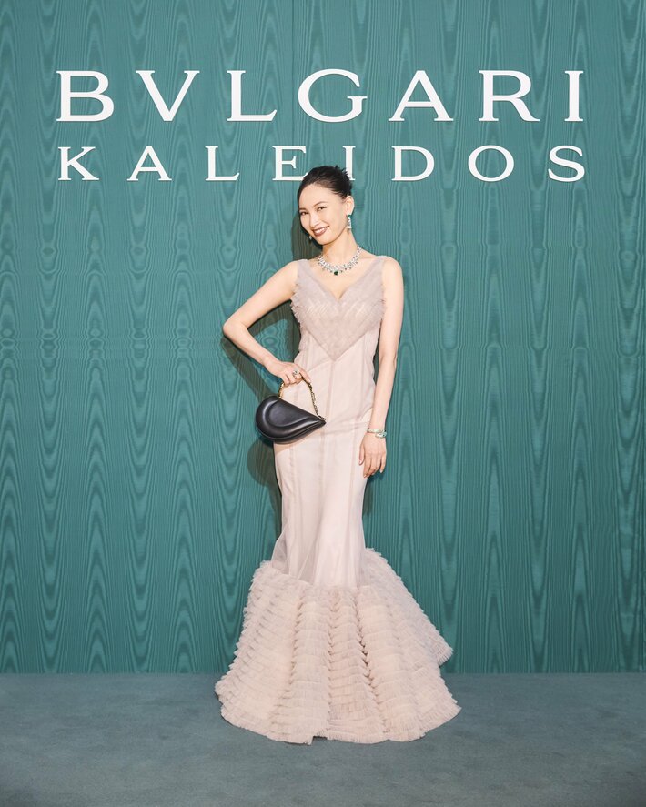 「今日は、本当に美しいエメラルドとダイヤモンドが入っているブルガリのジュエリーを着けさせていただいたので、ジュエリーが生きるような単⾊のドレスにしてみました。展覧会は、本当に見応えがあり、一つ一つのジュエリーがゆっくり見られるようになっているので、また改めて見に行きたいと思いました。一つ一つの部屋がディーヴァ ドリームの形になっているのがすごく魅力的で、天井まで見てしまいました」