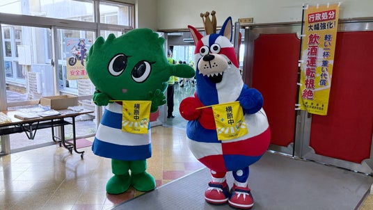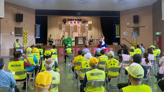 9月18日(木)に北中城村で開催された「秋の交通安全運動出発式」にゴーディーが参加しました。式典には沖縄警察署長をはじめ、各市町村の交通安全推進協議会関係者、北中城村地域活性化キャラクター「中ゆくりん」も参加し、北中城村立島袋小学校の児童会による交通安全宣言も行われました。