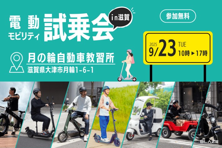 株式会社ブレイズ(愛知県名古屋市、代表取締役:市川 秀幸、以下 ブレイズ)は、2025年9月23日(火・祝)に、滋賀県大津市の「月の輪自動車教習所」にて開催される、JEMPA(一般社団法人日本電動モビリティ推進協会)と月の輪自動車教習所が共同主催する試乗会に参加いたします。