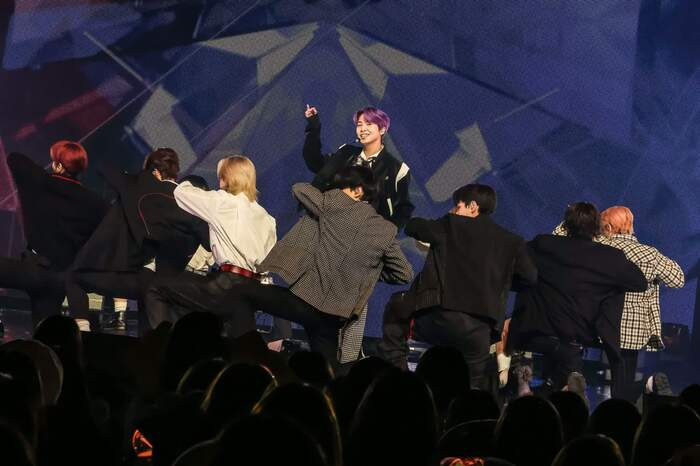 M1「With Us」を終え、一列に並んだJO1。河野さんが「ペンライト、プチョヘンザ!」と声をかけ、会場を盛り上げます。