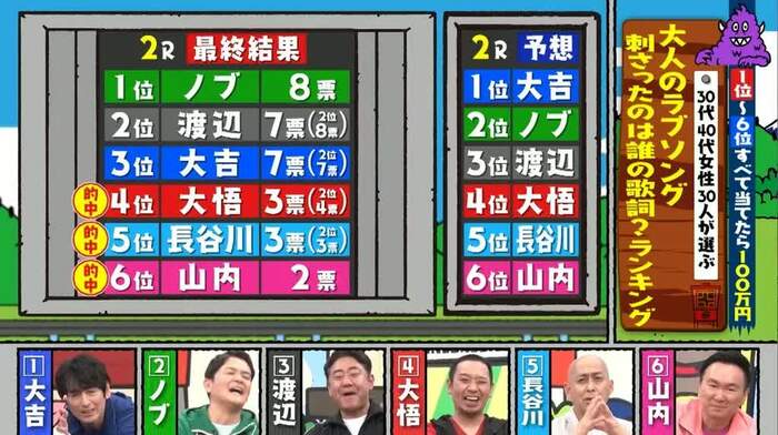 大吉さんのラブソングは「『30代、40代でも明るい恋愛していいんだよ』みたいな取り方できるのでは」(渡辺)、ノブさんのラブソングは「歌詞はめちゃくちゃいい!」(渡辺)という声が上がり、みな上位に予想。