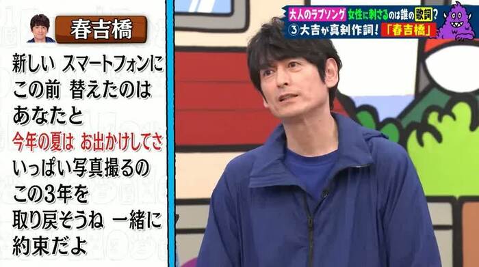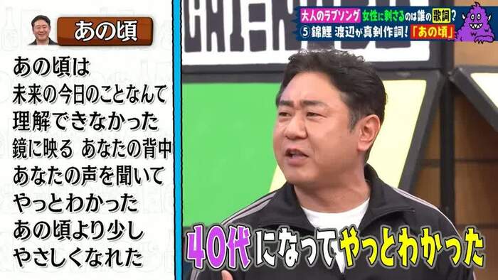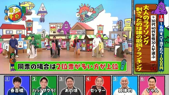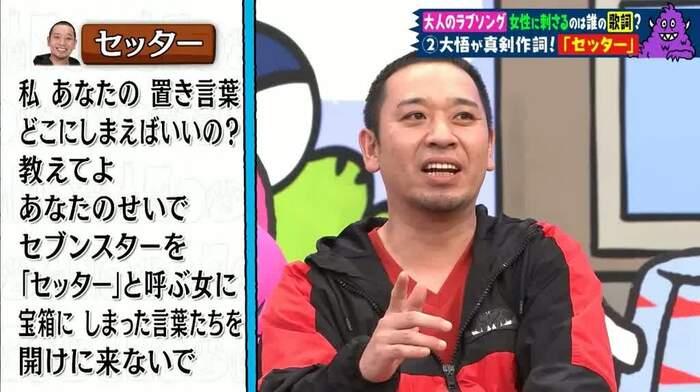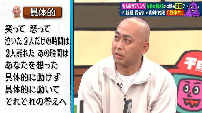 「大人のラブソング 刺さったのは誰の歌詞?ランキング」では、錦鯉、博多大吉さん、千鳥、山内さんの6人が、30代・40代女性に向けた「大人の恋愛」をテーマに作詞。