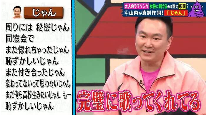 唐突な展開に、みな「え、何?」と困惑。「ダサっ!」「むちゃくちゃダサい!」「キツイなぁ、おまえ」と声が上がる中、山内さんは「完璧に歌ってくれてる!」と満足そうに拍手しました。
