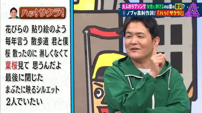 ラブソング企画を2連覇したノブさんは「自信持っていかなあかんなあ」とご満悦。