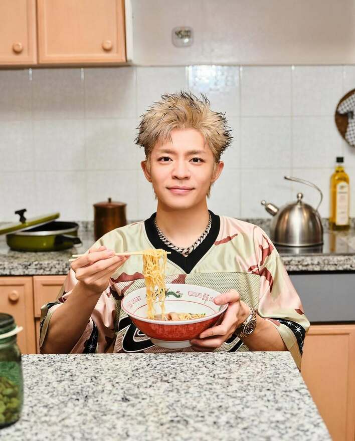 ラーメンが盛られた赤い器を持ち、麺を箸で持ち上げてカメラをにっこりと見つめる岸さん。