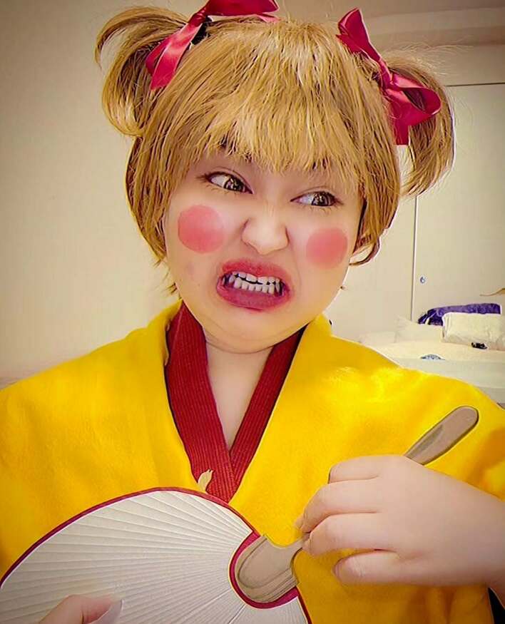 りんごちゃんが公開したは、黄色の髪をツインテールにし、頬と唇を赤く染めた、女装姿の善逸のコスプレ。歯を食いしばりながら目をひんむき、手に持つうちわを三味線に見たて、必死にかき鳴らしているようです。