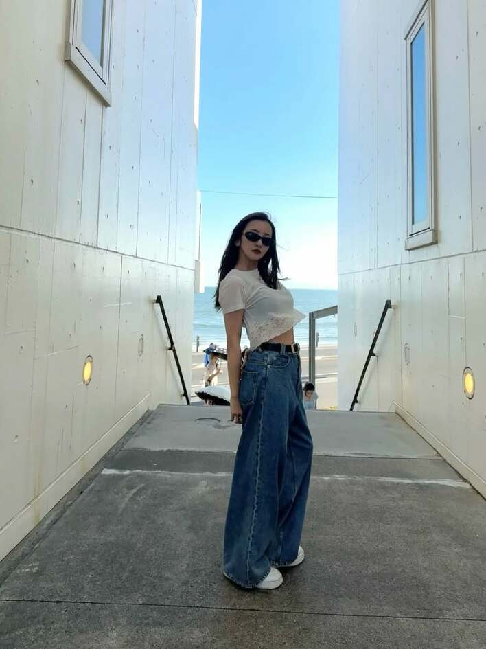 肩を後ろに反らせ、すらりとたたずんたショットでは、ショート丈のトップスからおなかがチラリ!