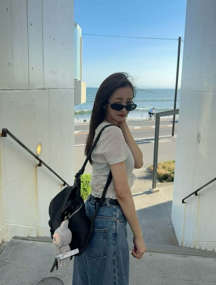 白いトップスにデニムを合わせたコーディネートで、ラブブをつけた黒い小さなリュックを背負っている板野さん。