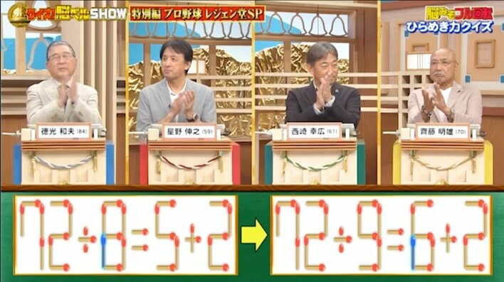 「72÷8=5+2」。この式のマッチ棒を1本だけ動かして正しい式にしてください。