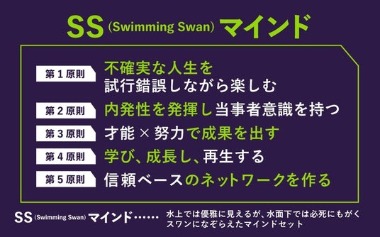 本書ではそうしたマインドセットを、水上では優雅に見えるが、水面下では必死にもがくスワンになぞらえ、SS(Swimming Swan)マインドと定義しています。SSマインドは5つの原則から構成されており、一つひとつがこれからの不確実性の時代で成果を出し続けるために必要な要素となっています。