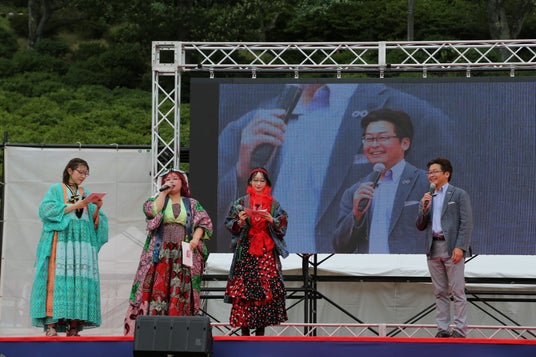 TETSUYAから佐々木鯖江市長へ「市長、鯖江の将来は安泰ですね!」とメッセージが送られると、市長を急遽ステージに呼び込み、さらに昨年に引き続き鷲頭美央福井県副知事も登壇。副知事は「皆さんのお力で昨年よりも盛り上がっていて嬉しく思います。今後も楽しいイベントをいろいろ開催し、楽しい福井にしていきたいです。」と語りました。続いて市長も「私たちは、3年間このSDGsフェスを続けてきました。これからも市民の皆さんと一緒に楽しい活動を続けていきたいと思いますので、よろしくお願いします。」と力強いメッセージを発信し、会場全体が大きな拍手に包まれました。