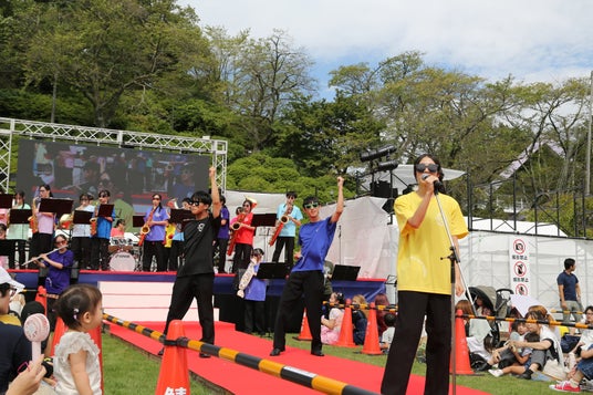 “めがねのまちさばえ応援プロジェクト スペシャルステージ”は、昨年に引き続き福井県立鯖江高等学校吹奏楽部が登場し、幅広い世代に長く愛されているアニメの主題歌「銀河鉄道999」から始まり、「め組のひと」「青春の輝き」「シロクマ」の生演奏を披露。さらに「YMCA」では、おなじみのダンスで盛り上げオープニングを華々しく飾りました!