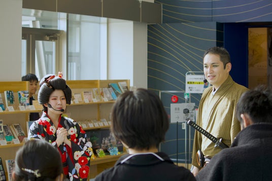 観光施設のロビーに集まった観光客に向け、役者が語り掛ける