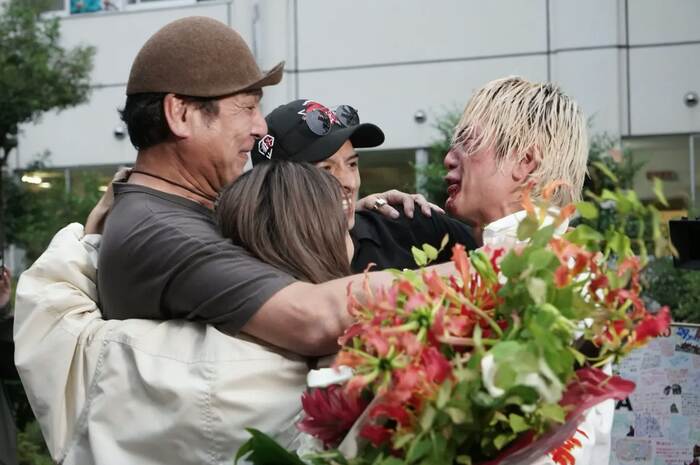 最後のカットの撮影が終わり、スタッフからクランクアップのかけ声がかかると、盛大な拍手と「うぉおおお!」という大きな歓声が。そして、それぞれに花束が贈られると、3人で熱い抱擁を交わしました。