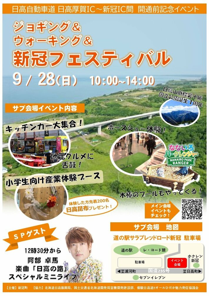 北海道日高振興局は、令和7年度に開通予定の日高自動車道日高厚賀IC~新冠IC間のPR事業として新冠町が主催するイベントに参加します。 ※新冠=にいかっぷ