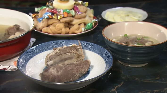 コロロンさんは「チャンスン・マハ」という、マトン(羊肉)を使ったモンゴルのおもてなし料理を調理してくれると説明。鍋に骨付きのマトンと水、モンゴルのハーブ岩塩を入れて、約2時間煮込んでいきます。