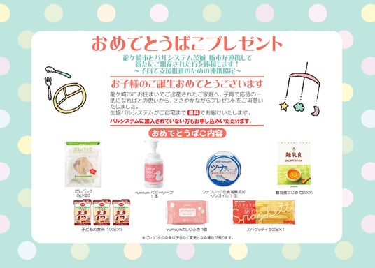 龍ケ崎市と締結するのは、「子育て支援の推進に係る連携協定」です。協定に基づき龍ケ崎市は、保健師による子育て世帯への「3~4か月児健診」のお知らせ時に、出生祝いとして育児用品を詰め合わせた「おめでとうばこ」の案内カードを配付します。出生祝いは、パルシステムが宅配サービスで届けるベビーソープやおしりふき、離乳食づくりに役立つ食材などを詰め合わせます。