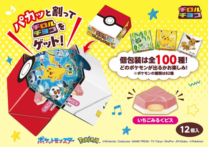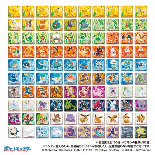 モンスターボールをイメージしたデザインの外装をパカッと割ってチロルチョコをゲット!個包装の種類は全100種類!なにが出てくるかはお楽しみ♪