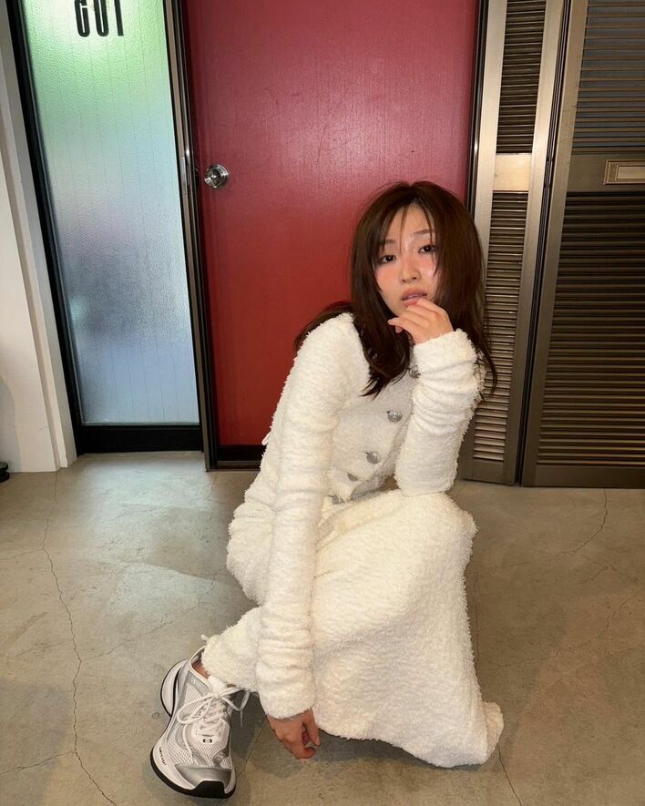 白のワンピースにスニーカーを合わせたコーデに艶っぽい表情をしているショットや