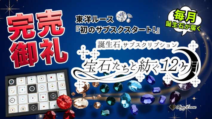 「笑顔創造」が企業理念の株式会社東洋(本社:埼玉県桶川市 代表取締役/中村秀夫 以下、当社)が運営する、研磨やカットが施された指輪などの、ジュエリー製品に加工される前の宝石「ルース(裸石)」を扱う、関東最大級のルース専門店「東洋ルース」が手掛ける、誕生石サブスクリプション「宝石たちと紡ぐ12ヶ月」(8/14“裸石の日”より受付開始)は、想定を大きく上回るお申し込みをいただき、このたび完売となりました。