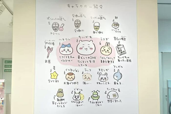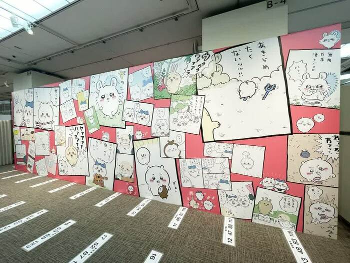 「ちいかわワクワクゆうえんち」に入るまでの待機列で、まず目にするのは大きなイラスト。これまでの漫画のコマがいくつも描かれており、待機している間も退屈させません。